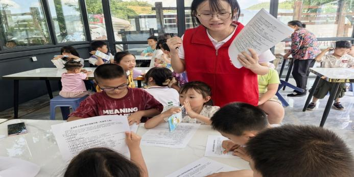 岚关乡的盛夏,青山含翠,蝉声阵阵。服务团首战告捷,以“防溺+普法”双课堂模式,联合司法所、派出所,在岚关村拉开了法治教育的序幕。团队成员以溺水事件为鉴,用通俗语言细述安全知识,现场演示溺水自救;同时,围绕《未成年人保护法》,解读危险信号与求助之道,同步发放防溺水手册,让安全成为未成年人成长的明丽底色。团队还融合法学与心理学,提出“勇者”概念,引导未成年人理性避险,同步推出线上法律指南二维码,为绿色乡村添彩。