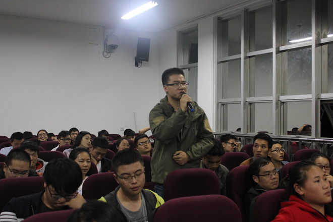 本次活动由潘善斌老师担任嘉宾,吸引了上百名同学的参与。活动开始,潘善斌老师就简要叙述了自己的学习和教学经历并开篇点题地就我国生态环境现状展开论述。重点谈及“海绵城市”国家试点之一的贵安新区,其渗水设备、地下蓄水池、生态文明实验馆都是高科技的集中体现;提出贵州高端化、节约化、绿色化的发展定位以及重视绿色价值取向、生态补偿等问题。