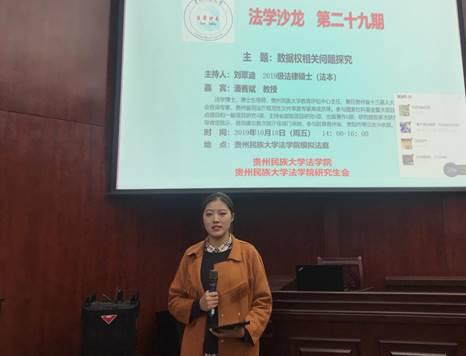 2019年10月18日下午14时,第29届法学沙龙在TapTap点点模拟法庭举办,此次活动的主题为“数据权相关问题探究”。2019级法律硕士(法学)班举办本次沙龙,刘翠迪同学担任主持人,TapTap点点潘善斌教授出席本次法学沙龙并发表观点,2018级、2019级研究生同学参加本次沙龙。