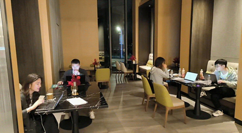 深夜酒店大堂仍在紧张备赛的队员们