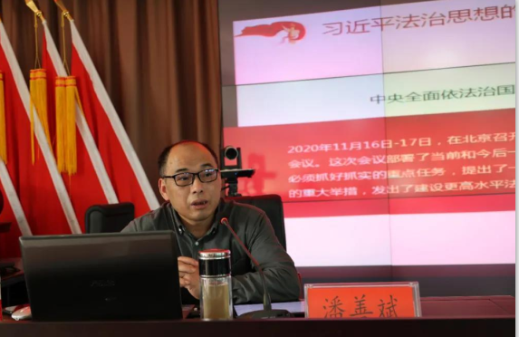 潘善斌教授围绕习近平法治思想的形成背景、习近平法治思想的重要地位、习近平法治思想的主要内容展开宣讲。对习近平法治思想核心要义进行阐述;用“十一个坚持”对党内系列文件和习近平总书记自党的十八大以来对全面推进依法治国系列重要讲话进行解读;从理论意义、实践意义、历史意义、世界意义上诠释了习近平法治思想的重要地位;从坚持党对全面依法治国的领导、坚持以人民为中心、坚持中国特色社会主义法治道路、坚持依宪治国、依宪执政,坚持在法治轨道上推进国家治理体系和治理能力现代化,坚持建设中国特色社会主义法治体系,坚持“三个共同推进”“三个一体建设”,坚持全面推进科学立法、严格执法、公正司法、全民守法,坚持统筹推进国内法治和涉外法治,坚持建设德才兼备的高素质法治工作队伍,坚持抓住领导干部这个“关键少数”这11个方面宣讲了习近平法治思想的主要内容。