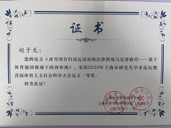 上海市研究生学术论坛暨首届体育人文社会科学大会优秀论文一等奖